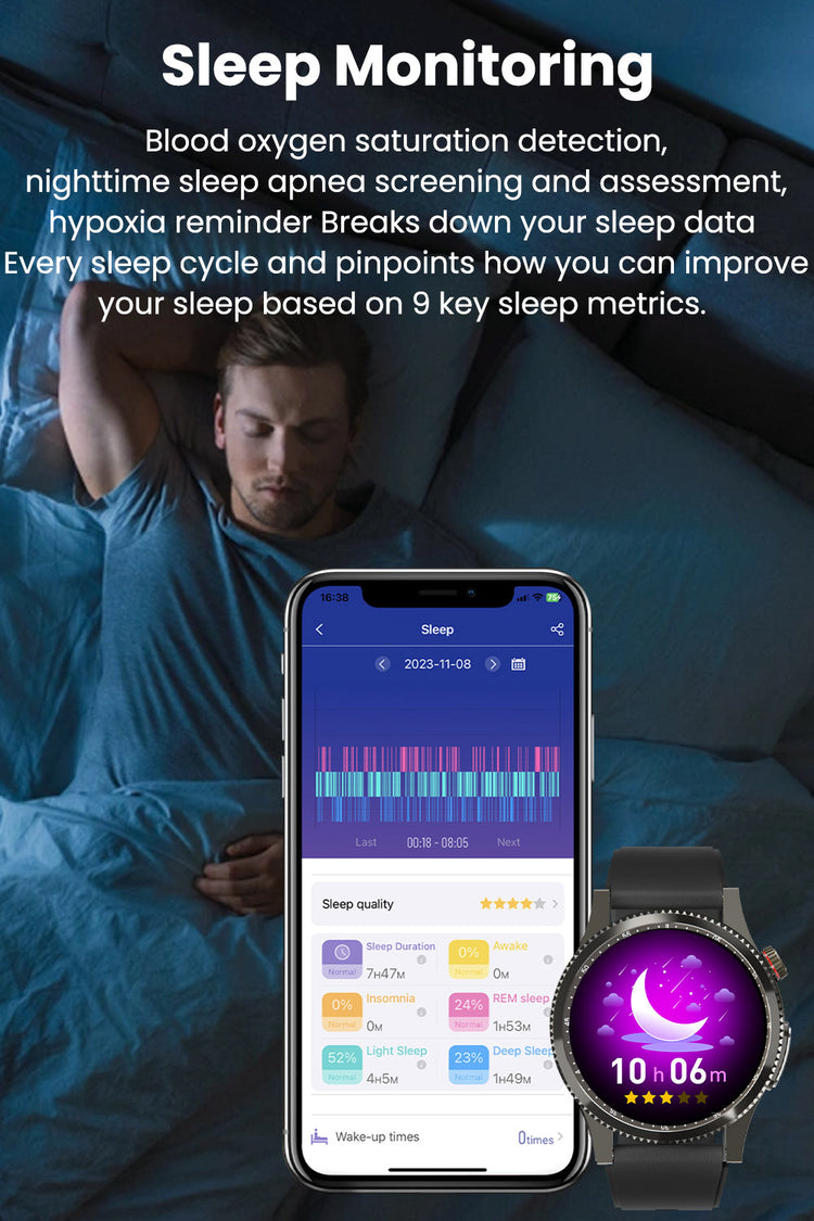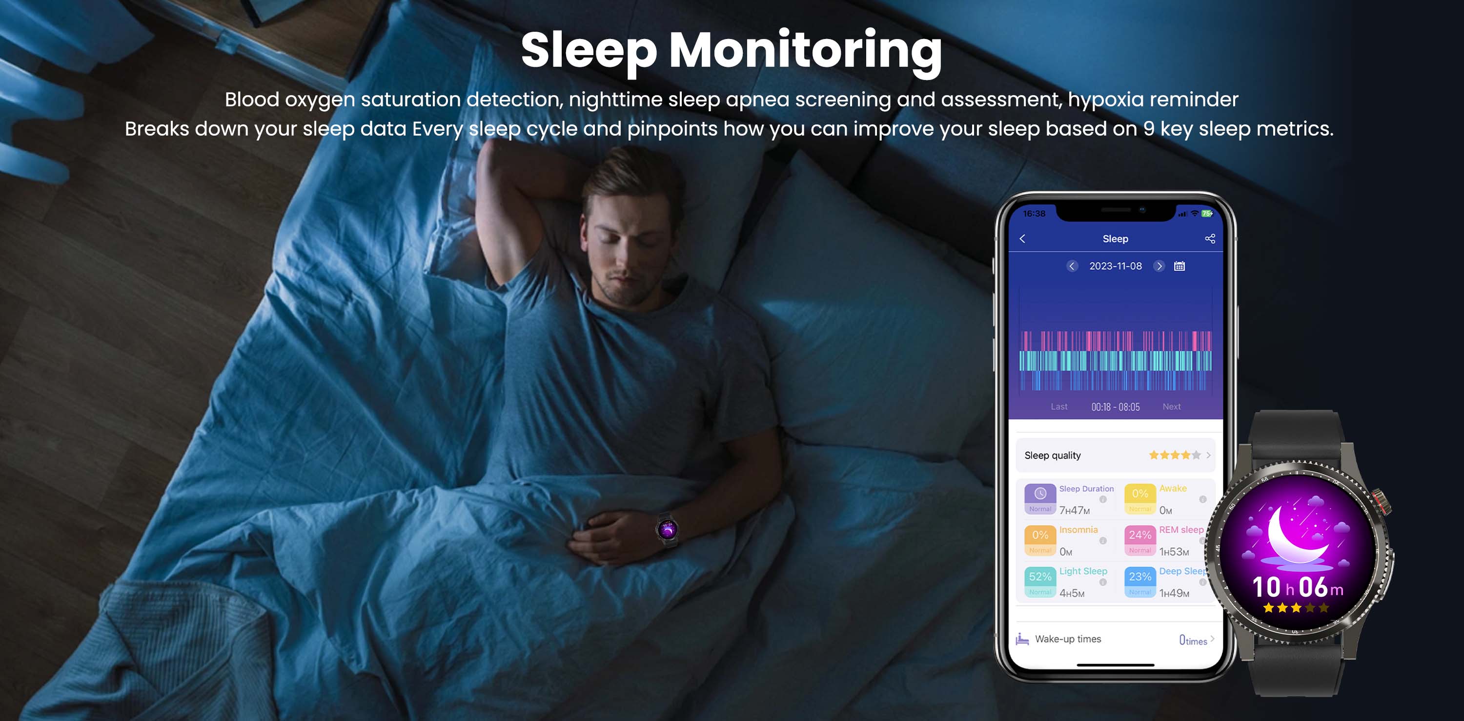 Continuously track your blood oxygen saturation, analyze your sleep health and respiratory health, respiratory rate, sleep apnea.