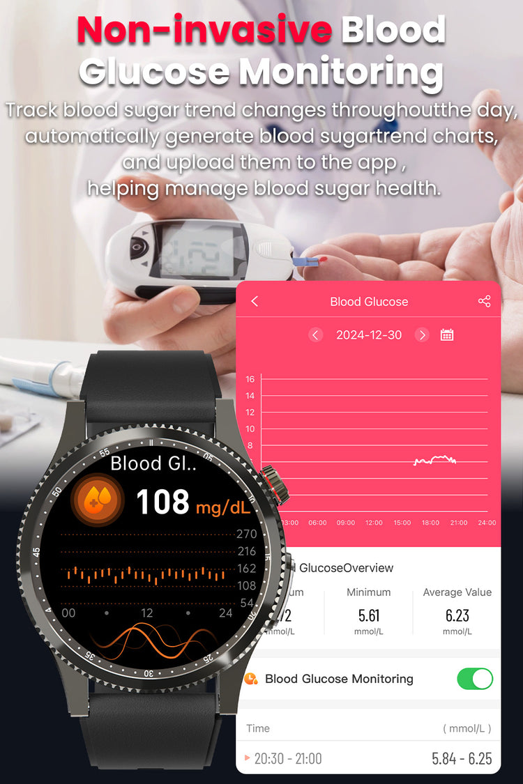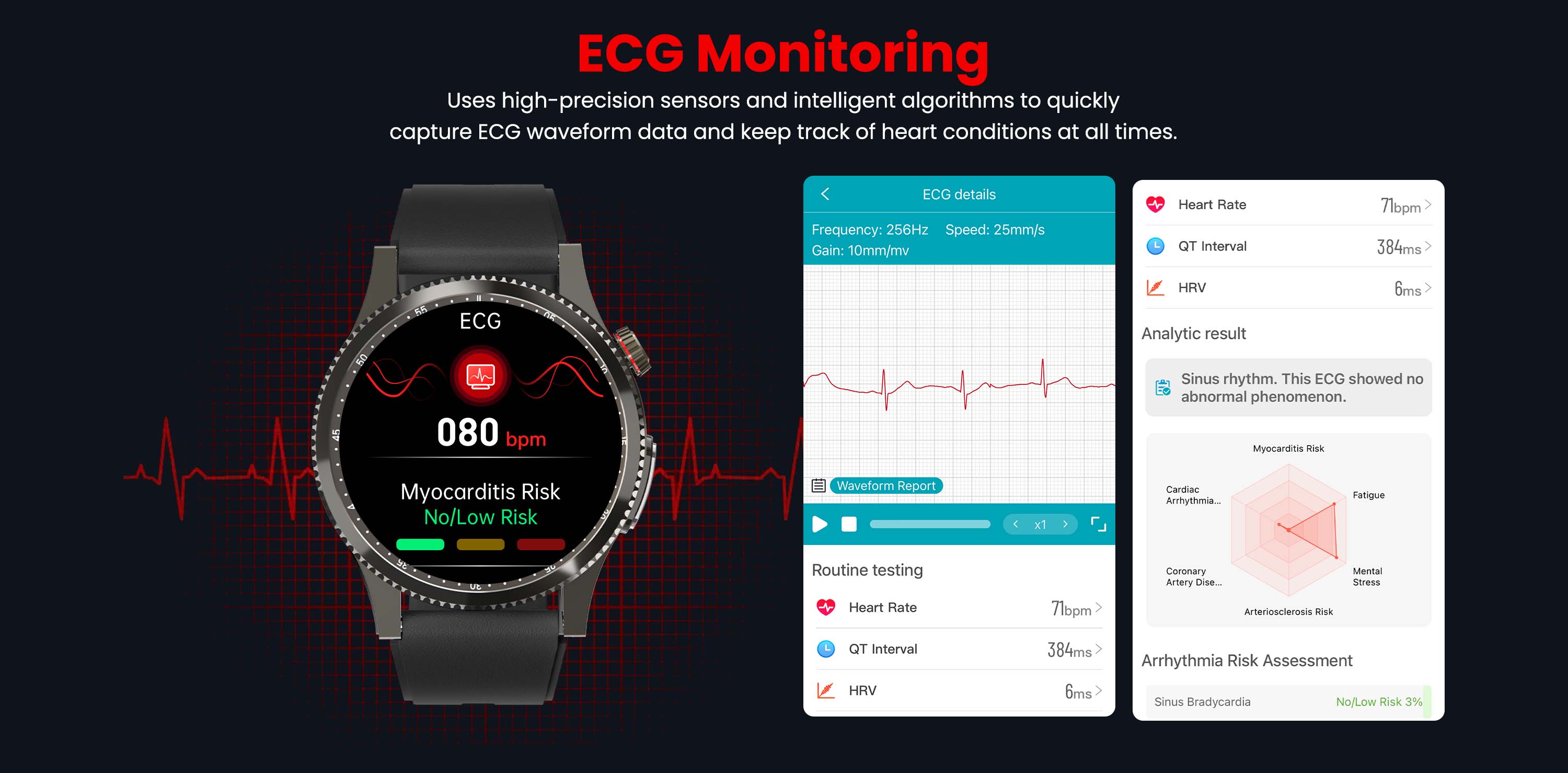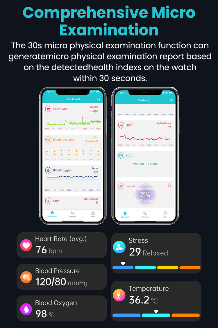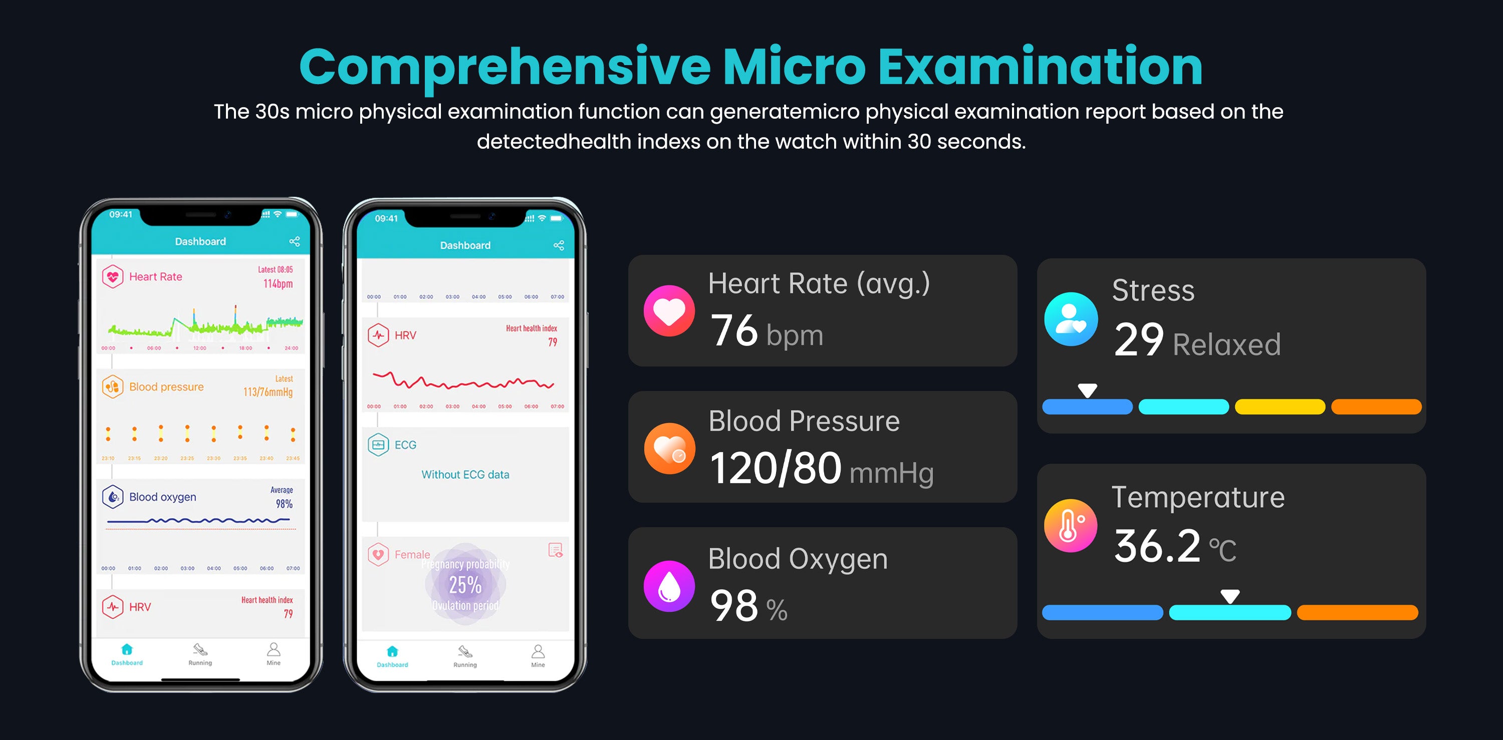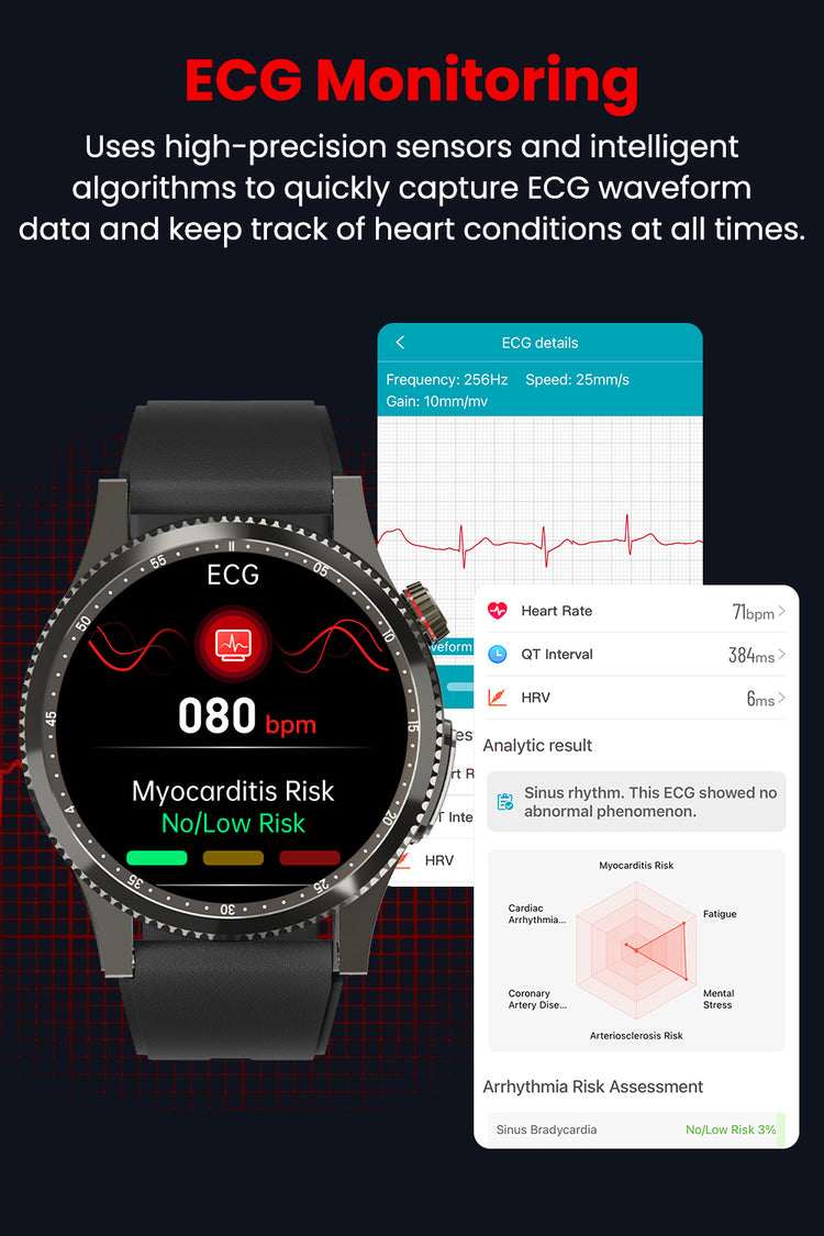Health monitoring - ecg, blood glucose, body composition, blood pressure, heart rate, blood oxygen and beats per minute (BPM). All in real time!