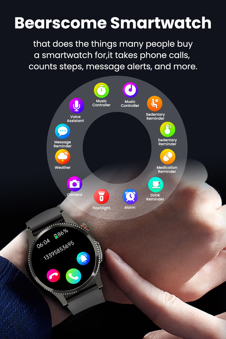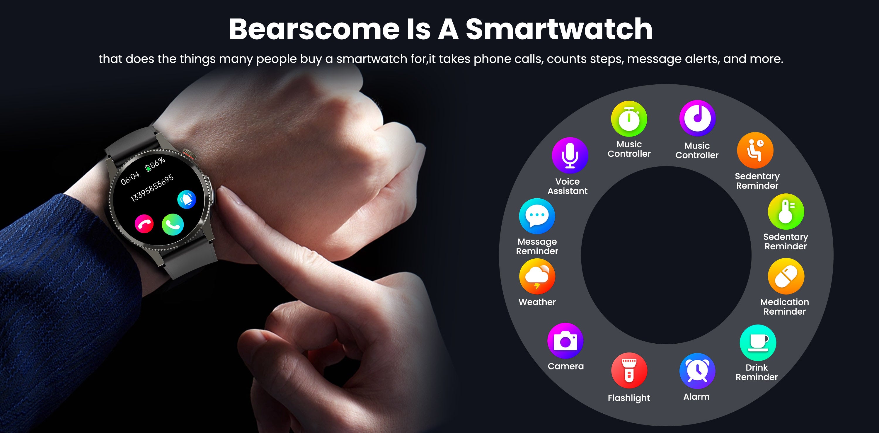 Bearscome is a smartwatch that does the things many people buy a smartwatch for: it takes phone calls, counts steps, message alerts, and more.