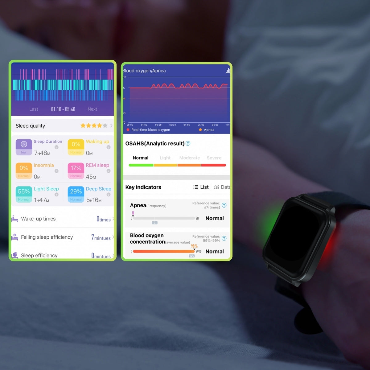 SATURATION(SpO2)Two groups of red led light and infrared led light coupled with expertly developed blood oxygen algorithm to determine your blood oxygen level.Automatically monitors Spo² levelat night to prevent apnea, if your Spo² values remain in a dangerous range, which may affect your health, RIG will issue an alarm in time.