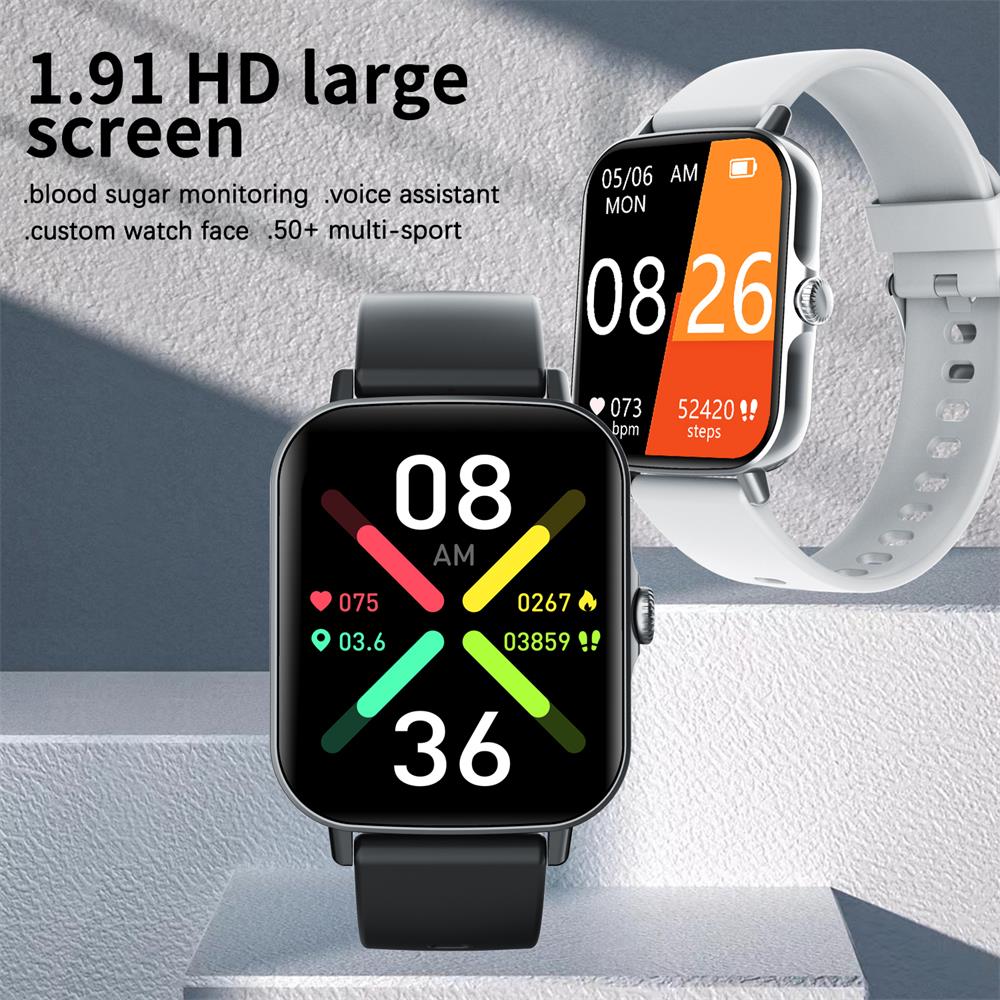 Pantalla grande de alta definición de 1,91 pulgadas | Monitoreo de azúcar en la sangre | Esfera de reloj personalizada Monitoreo de salud las 24 horas | Llamadas Bluetooth | asistente de voz | Reconocimiento inteligente de gestos Monitoreo del sueño | Modo multideporte | Monitoreo de la temperatura corporal